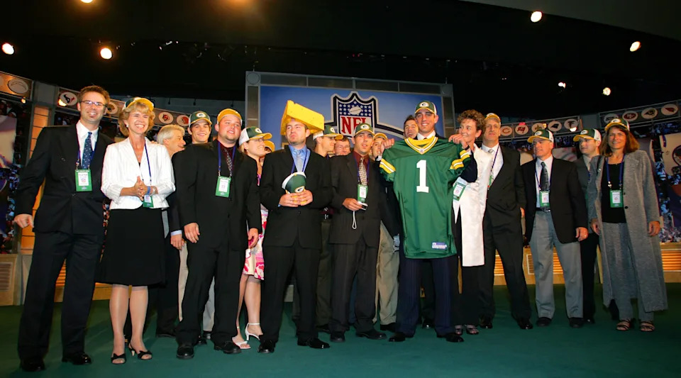 Aaron Rodgers, the Green Bay Packers’ first round pick in the 2005 NFL draft, is introduced by GM Ted Thompson on April 24, 2005.
