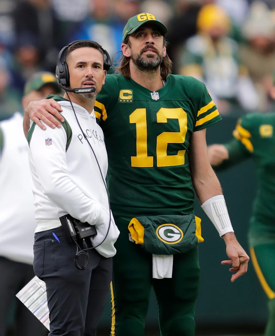 Green Bay Packers head coach Matt LaFleur and quarterback Aaron Rodgers stand arm in arm late in the fourth quarter of a 24-10 win against the Washington Football Team on Oct. 24, 2021, at Lambeau Field