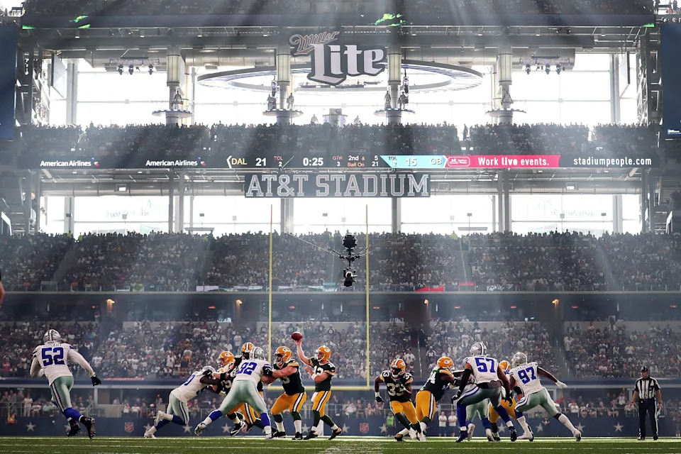 Aaron Rodgers looks for an open receiver during the Green Bay Packers’ game against the Dallas Cowboys at AT&T Stadium on Oct. 8, 2017 in Arlington, Texas. The Packers won the game, 35-31.