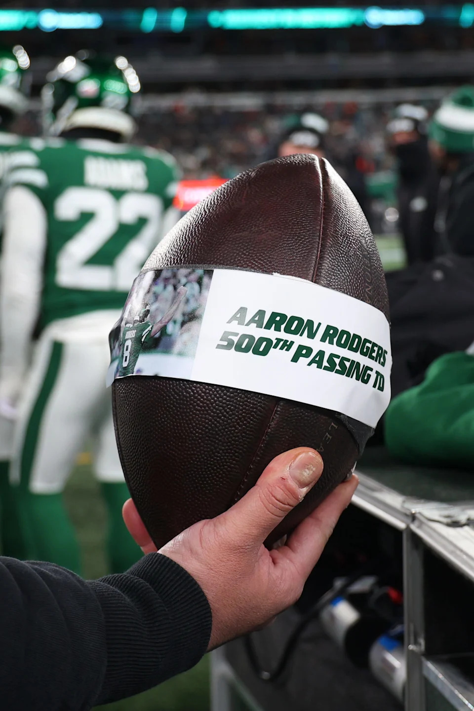 The ball used by New York Jets quarterback Aaron Rodgers for his 500th touchdown pass is seen on the sideline during the second quarter of the Jets game against the Miami Dolphins at MetLife Stadium on Jan. 5, 2025.
