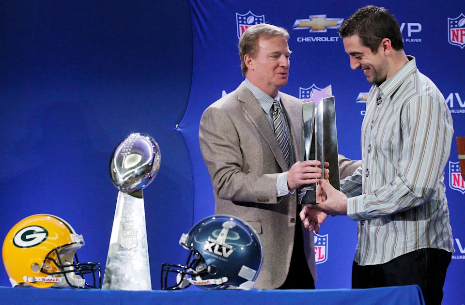 NFL commissioner Roger Goodell presents the Super Bowl MVP trophy to Green Bay Packers quarterback Aaron Rodgers at a news conference on Feb. 7, 2011 in Dallas, Texas. The Packers defeated the Pittsburgh Steelers 31-25 to win Super Bowl XLV.