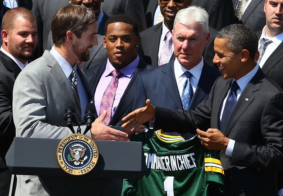 President Barack Obama receives a jersey from quarterback Aaron Rodgers (L) of the Green Bay Packers during a reception for the National Football League Super Bowl XLV champions on the south lawn of the White House on Aug. 12, 2011 in Washington, D.C. The Packers, lead by head coach Mike McCarthy, finished the 2010 season with a winning record of 10-6, and defeated the Pittsburgh Steelers 31-25 to win the championship.