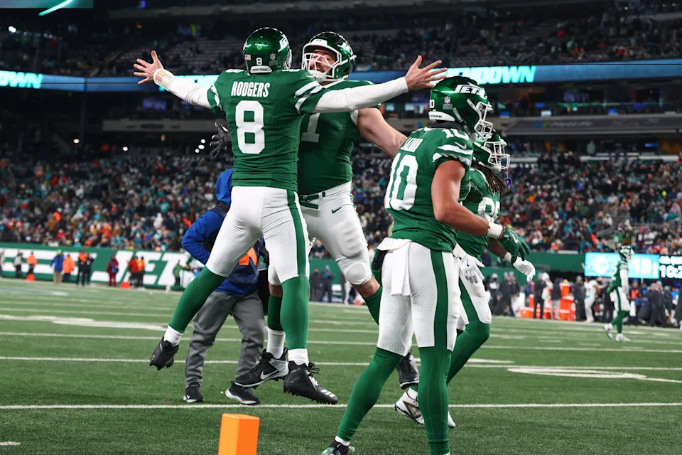 New York Jets quarterback Aaron Rodgers (8) celebrates his touchdown pass to New York Jets wide receiver Davante Adams (17) (not pictured) during the fourth quarter of their game against the Miami Dolphins at MetLife Stadium on Jan. 5, 2025.