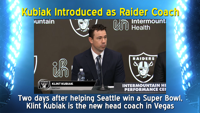 Klint Kubiak was introduced as the new head coach of the Las Vegas Raiders yesterday. He thanked the Seahawks, John Schneider and Mike Macdonald for helping him get to this position.