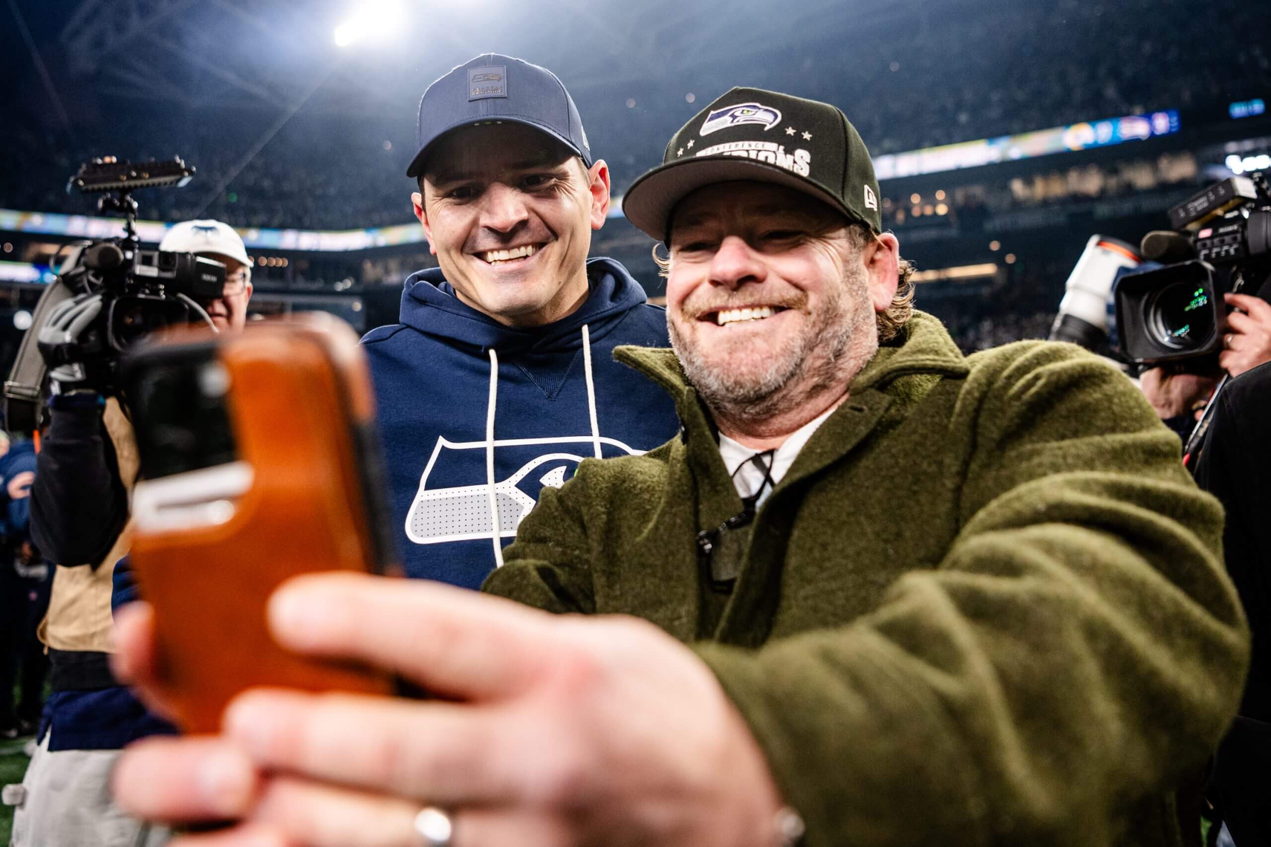 Seahawks coach Mike Macdonald and general manager John Schneider celebrate after the NFC Championship game. (Photo by Jane Gershovich / Getty Images)