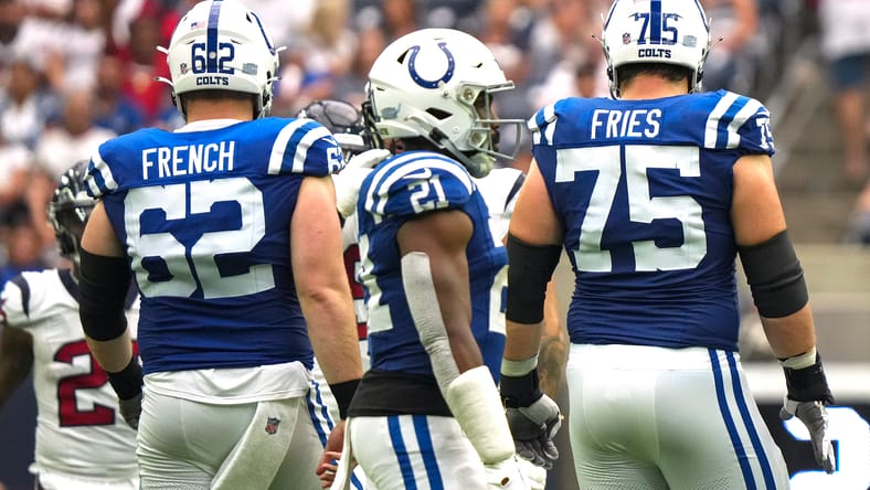 Sep 17, 2023; Houston, Texas, USA; Indianapolis Colts center Wesley French (62) and guard Will Fries (75) stand next to each other before beginning an offensive play during a game against the Houston Texans at NRG Stadium. Mandatory Credit: Jenna Watson-USA TODAY Sports