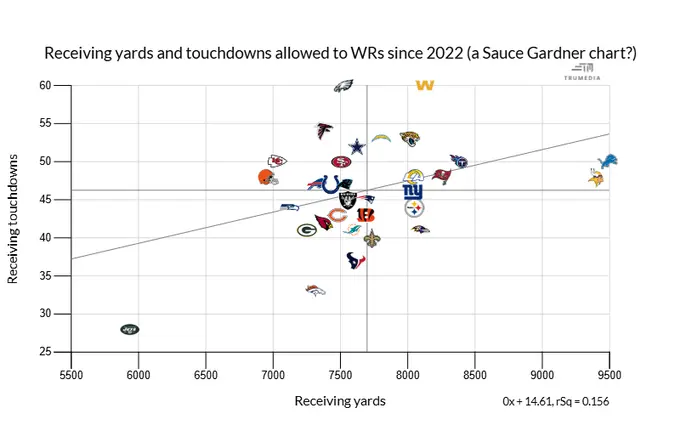 The latter stat reflects the reality that it’s a team effort between the pass rush and coverage to produce great pass-defense stats like these, but one look at the production allowed to specifically WRs gives us a pretty, pretty, pretty good idea as to what position group is especially thriving.