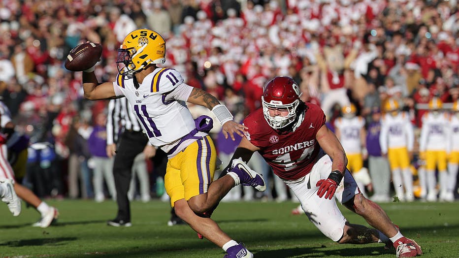NORMAN, OKLAHOMA – NOVEMBER 29: Michael van Buren Jr. #11 of the Louisiana State Tigers scrambles with the ball under pressure from Taylor Wein #44 of the Oklahoma Sooners during the first quarter of the game at Gaylord Family Oklahoma Memorial Stadi