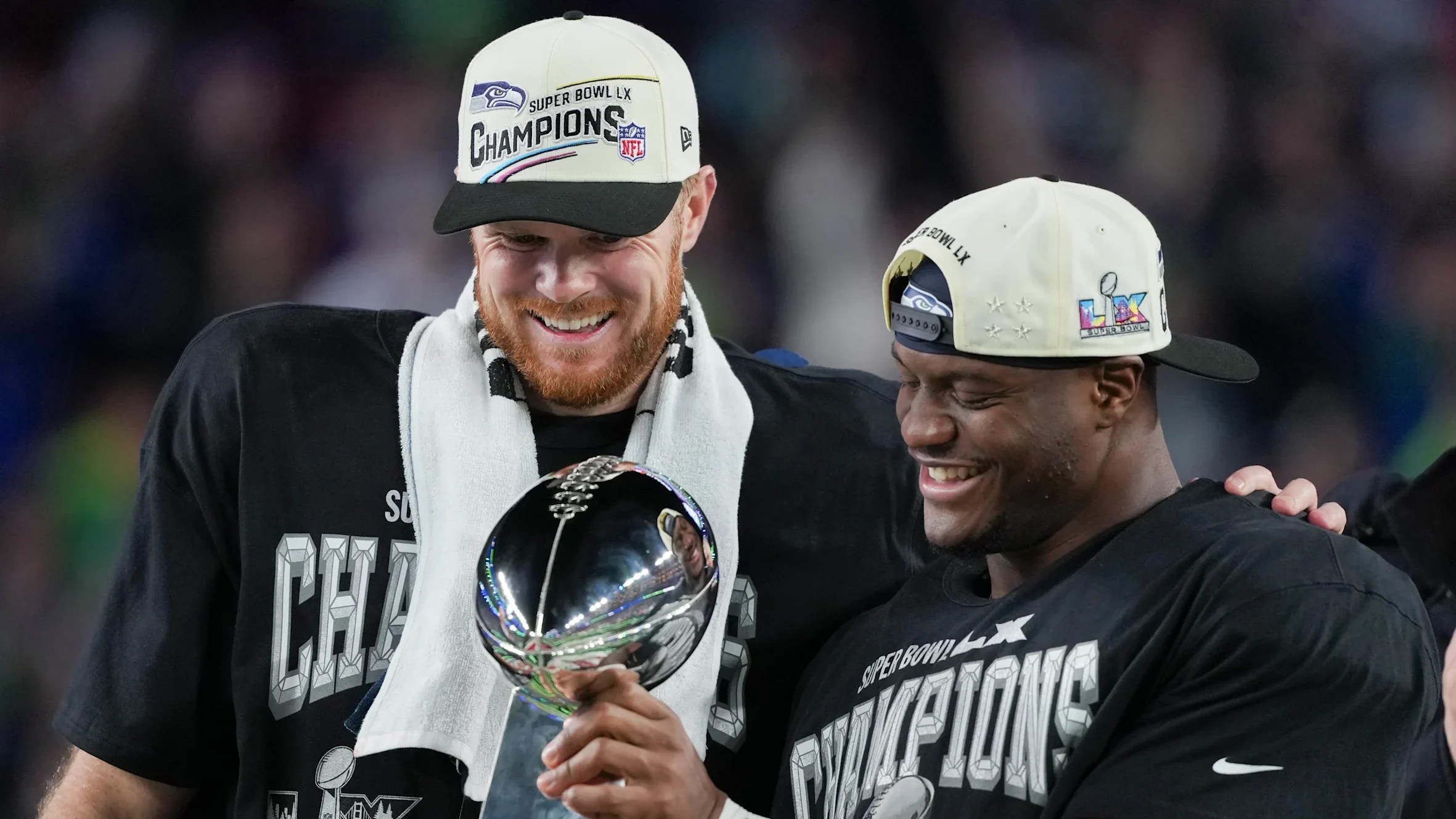 Seahawks quarterback Sam Darnold (left) and running back Kenneth Walker III (right) celebrate with the Lombardi Trophy.