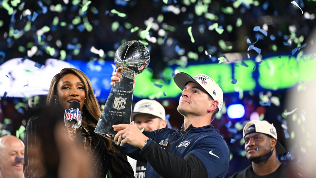 The Seahawks Head Coach Mike Mcdonald holding the Lombardi trophy after the win.