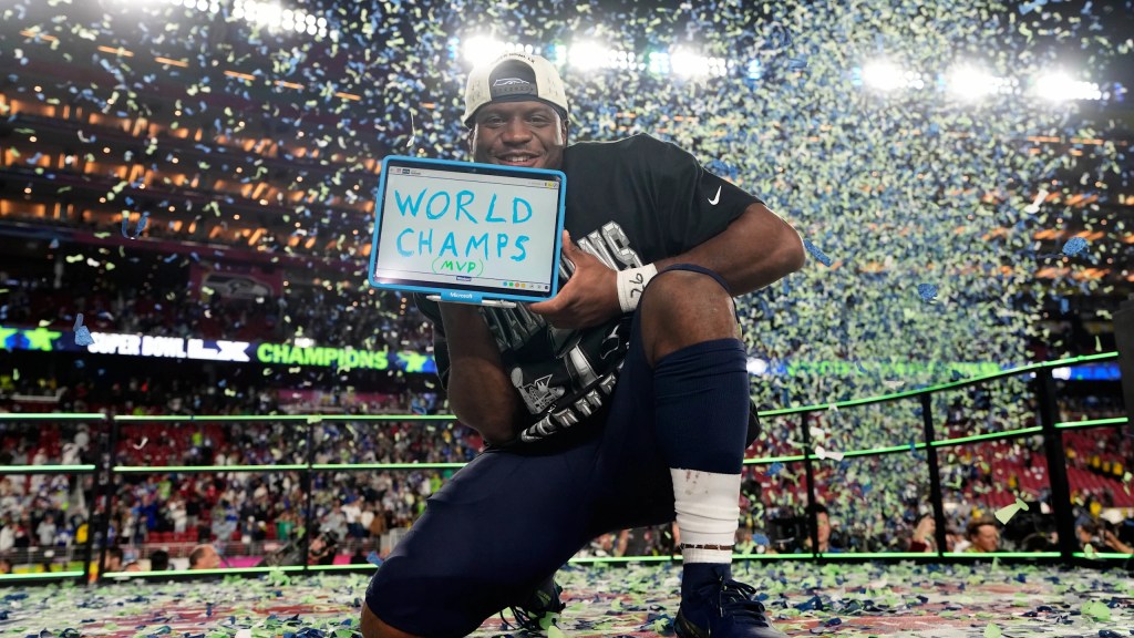 Seahawks running back Kenneth Walker III holds a Microsoft Surface tablet after defeating the New England Patriots in Super Bowl LX.