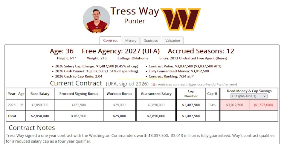 Because Tress Way has been with the Commanders for at least four continuous uninterrupted seasons (this is his 13th season in Washington) and the value of his contract is not more than $1.55m more than the vet minimum for a player with 12 accrued seasons, his cap number is just $1.487m for the 2026 season.