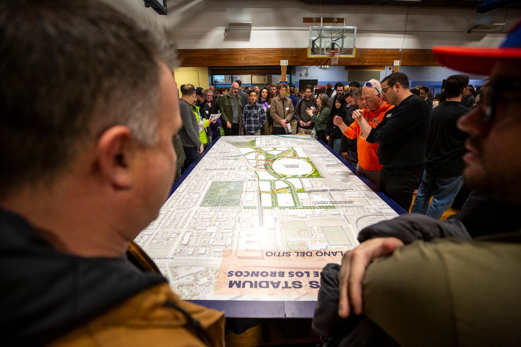 People at a community meeting pore over a map of Burnham Yard, where the Denver Broncos are planning a new stadium that is poised to create a new neighborhood. Feb. 12, 2026.