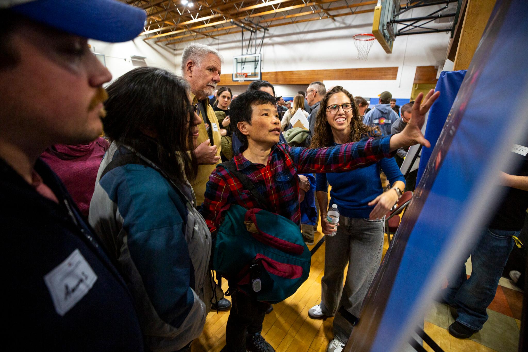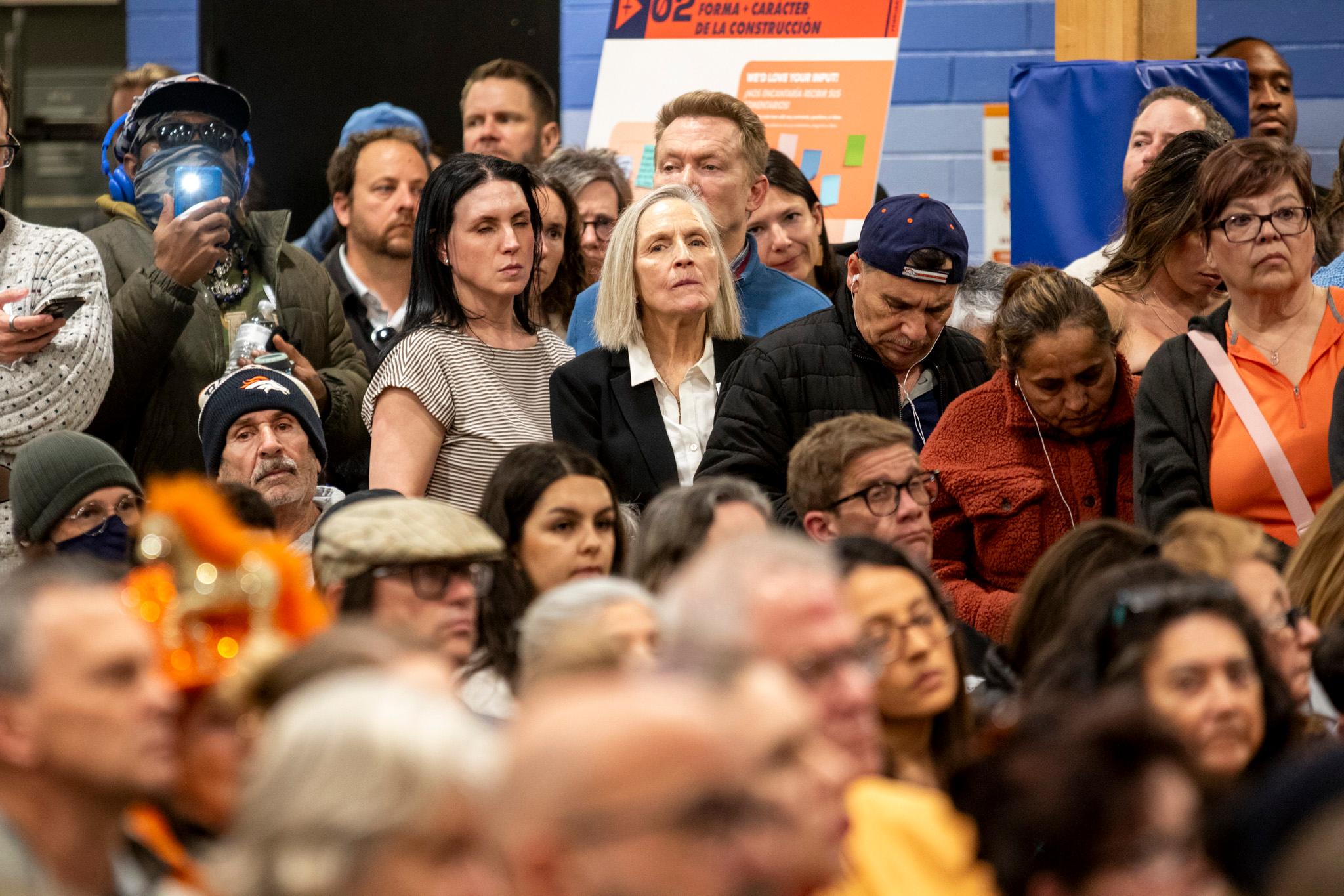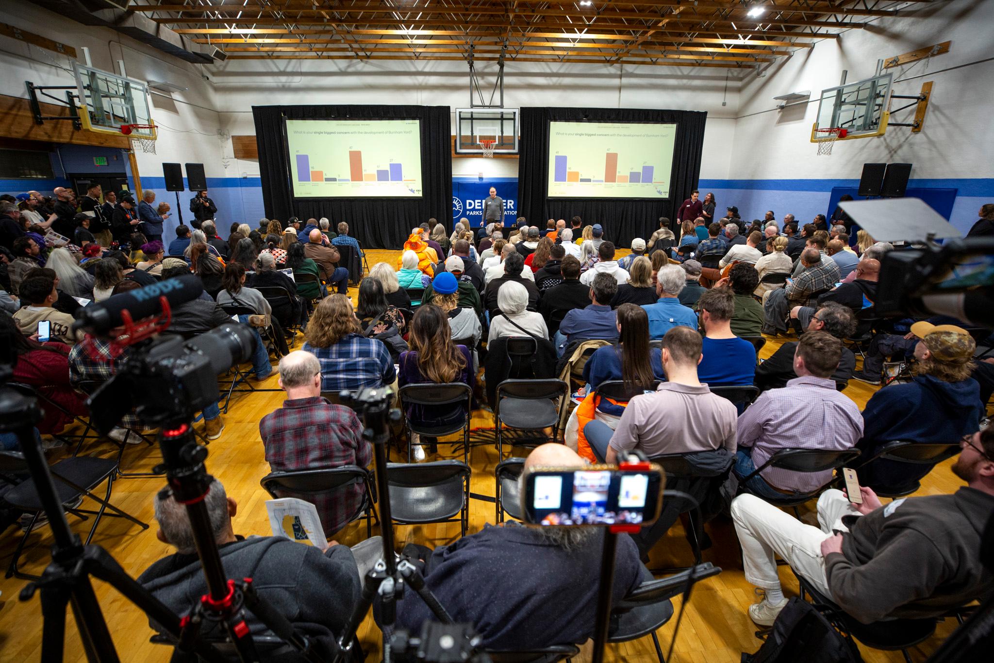 People gather at the La Alma-Lincoln Park Rec Center for a meeting with the Denver Broncos and city planners about the future of Burnham Yard, where a new stadium is poised to create a new neighborhood. Feb. 12, 2026.Kevin J. Beaty/Denverite