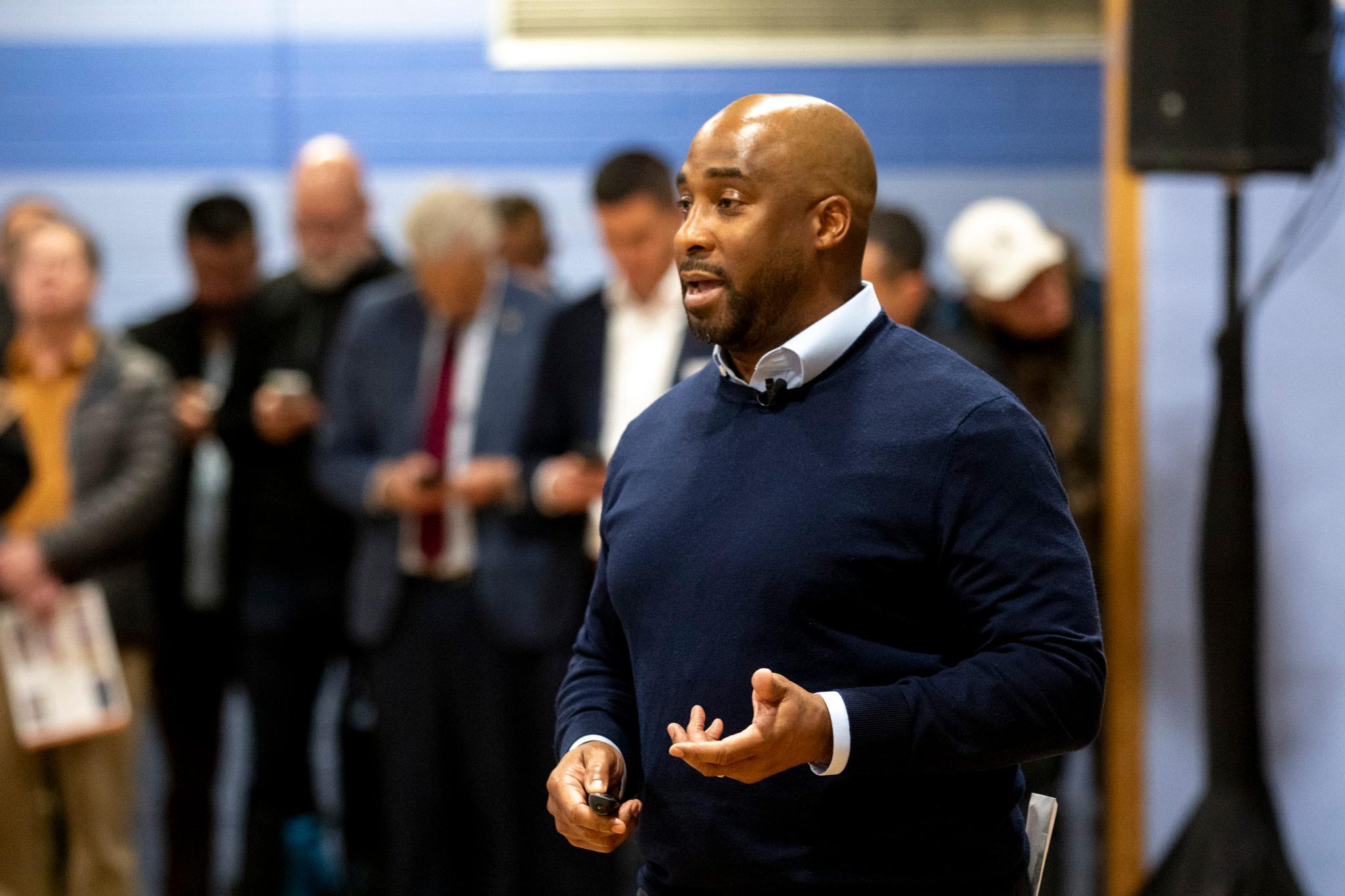 Damani Leech, president of the Denver Broncos, speaks to a gym full of people at the La Alma-Lincoln Park Rec Center during a about the future of Burnham Yard, where a new stadium is poised to create a new neighborhood. Feb. 12, 2026.Kevin J. Beaty/Denverite