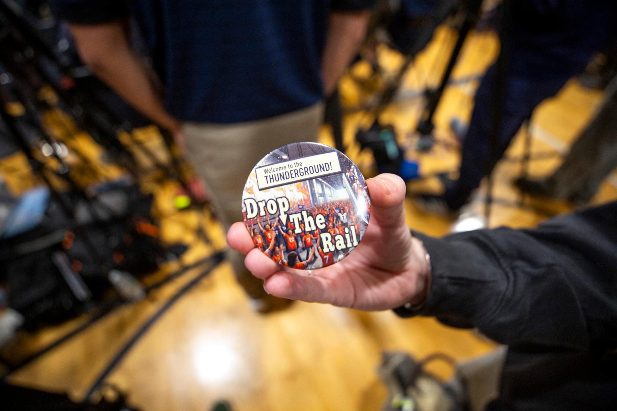Scott Young was passing out buttons with slogans like “Drop The Rail” and “Welcome to the Thunderground.”