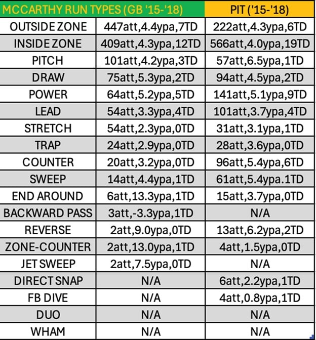 A new chapter for the Pittsburgh Steelers is here, including head coach Mike McCarthy among many changes. Today, I wanted to continue to learn more about his stats resume. Following a Passing Game Track Record Study, rush types and success rates were my next goal.