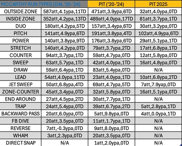The 2025 Steelers running game also saw a vast change, with pitch being the scheme ran most (102 attempts). It seemed to be a favorite run check for QB Aaron Rodgers, who was trusted to do so often, potentially boosting those numbers. Pitch was a top-four scheme for McCarthy at both coaching spots, so it will be interesting to watch moving forward.