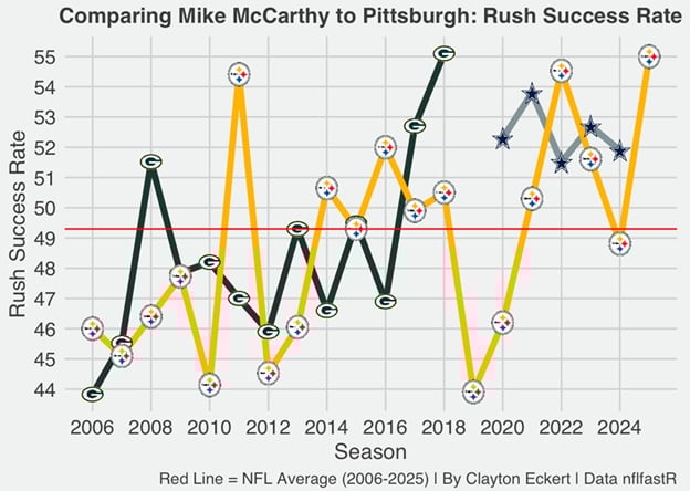 Similarly, Pittsburgh was above the line four of the last five seasons, with 2024 being the exception (48.81 percent), capped off with their strongest mark of the span last year. This reiterates the progress that was felt watching Pittsburgh compared to 2024. Paired with McCarthy’s vast improvements in his last seven years, it has me quite optimistic for what the running game could look like.