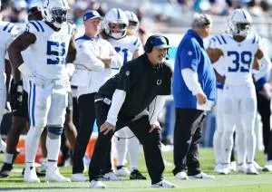 Colts Defensive Coordinator and former Jaguars Head Coach Gus Bradley on the sideline during late fourth quarter action. The Jacksonville Jaguars hosted the Indianapolis Colts at EverBank Stadium in Jacksonville, FL Sunday, October 15, 2023. The Jaguars ended the first half with a 21 to 6 lead and won with a final score of 37 to 20.