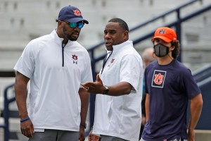 Apr 17, 2021; Auburn, Alabama, USA; Auburn Tigers defensive coordinator Derek Mason (right) talks with cornerbacks coach Zac Etheridge during warmups before the start of the spring game at Jordan-Hare Stadium. Mandatory Credit: John Reed-USA TODAY Sports