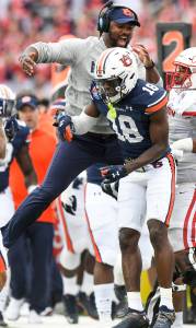 Auburn cornerbacks coach Zac Etheridge celebrates with Auburn Tigers defensive back Nehemiah Pritchett (18) after an interception against Houston during the Birmingham Bowl at Protective Stadium in Birmingham, Ala., on Tuesday December 28, 2021. Syndication: The Montgomery Advertiser