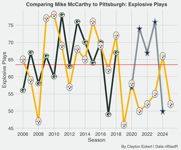 First up is a visual of McCarthy’s explosive play results for his head coaching career, along with Pittsburgh for comparison: