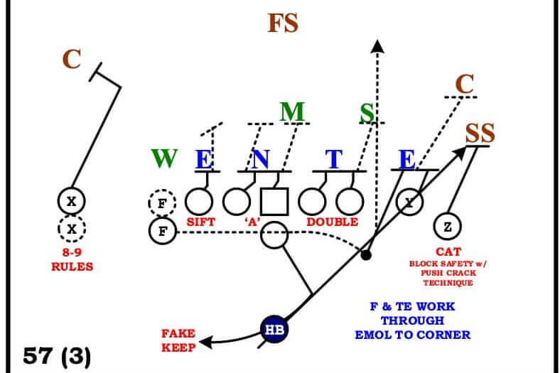 Above is a diagram from Kyle Shanahan’s 2018 playbook in which the “F” motions to the play side.