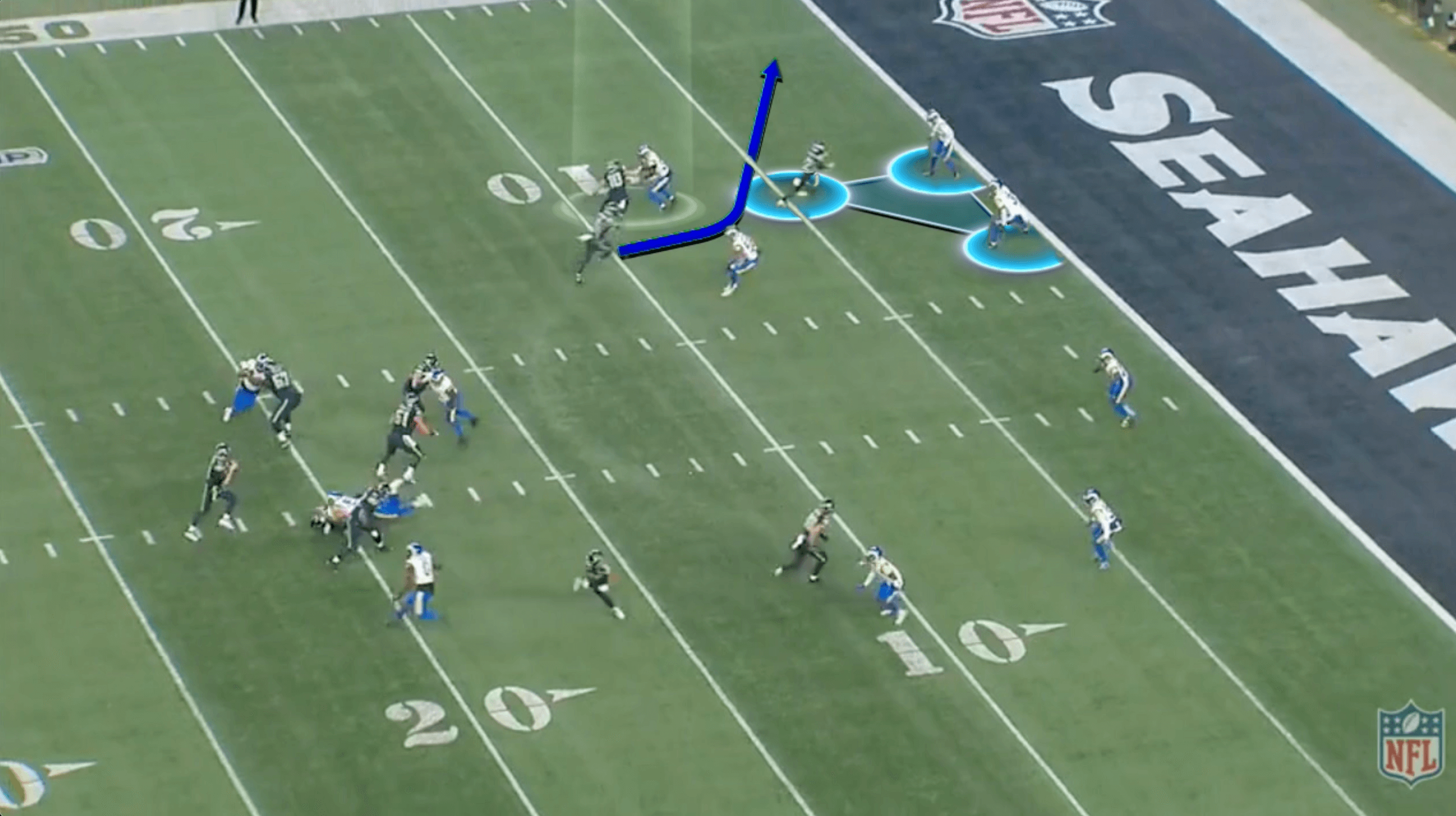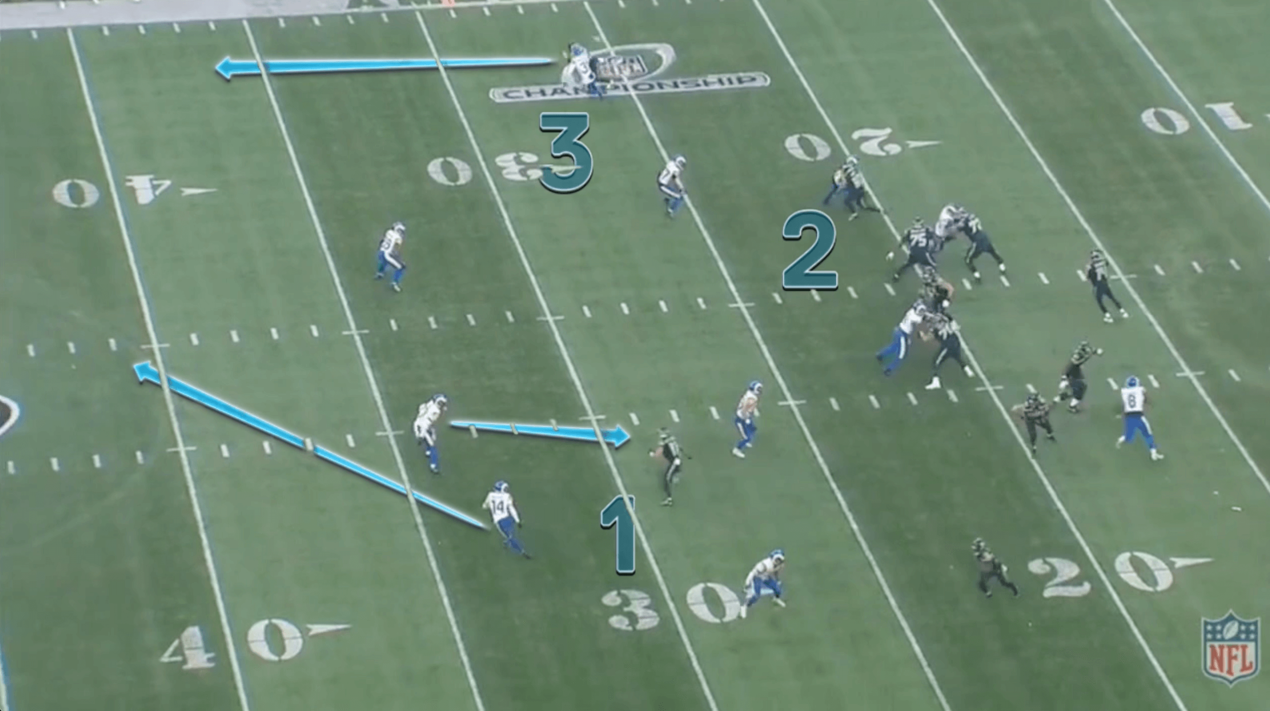After getting burned by Shaheed earlier, both the corner and safety were overly concerned with him running a post and ran with him. Kupp held the flat defender underneath and no one was left to cover Smith-Njigba.