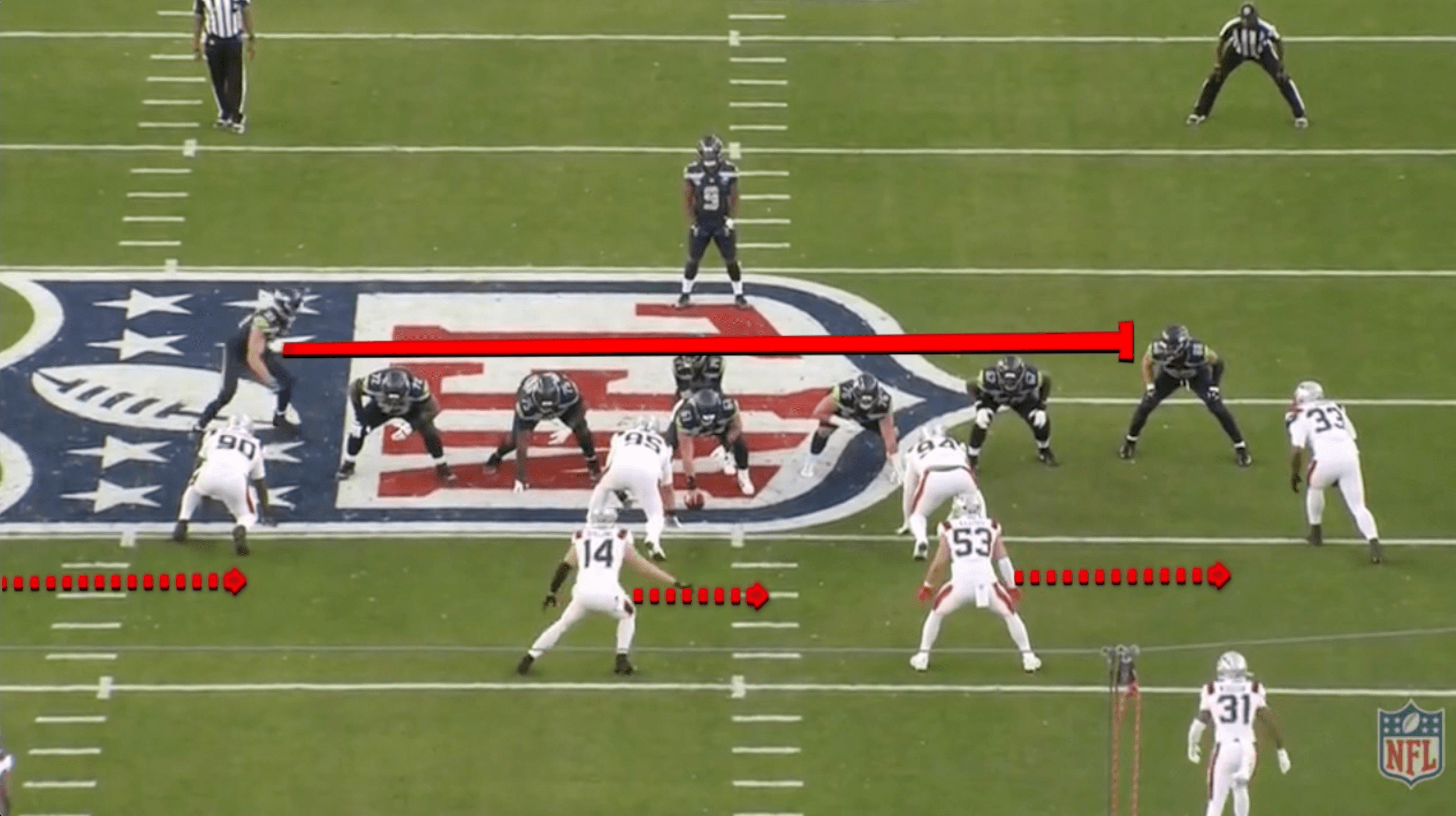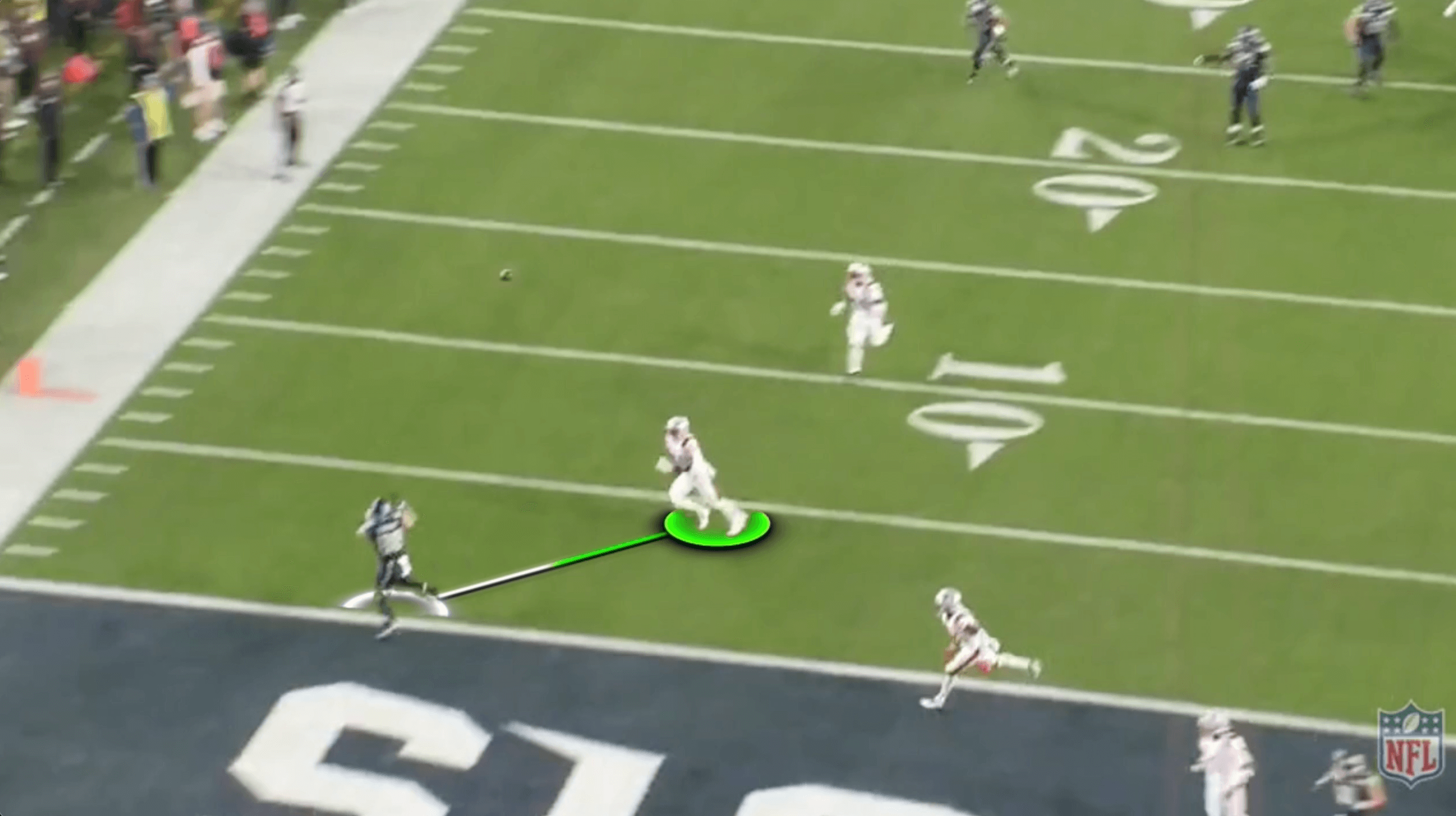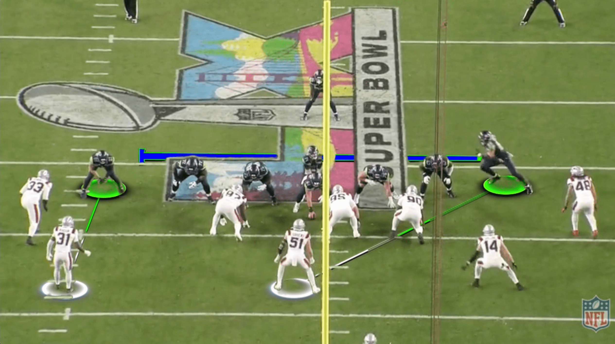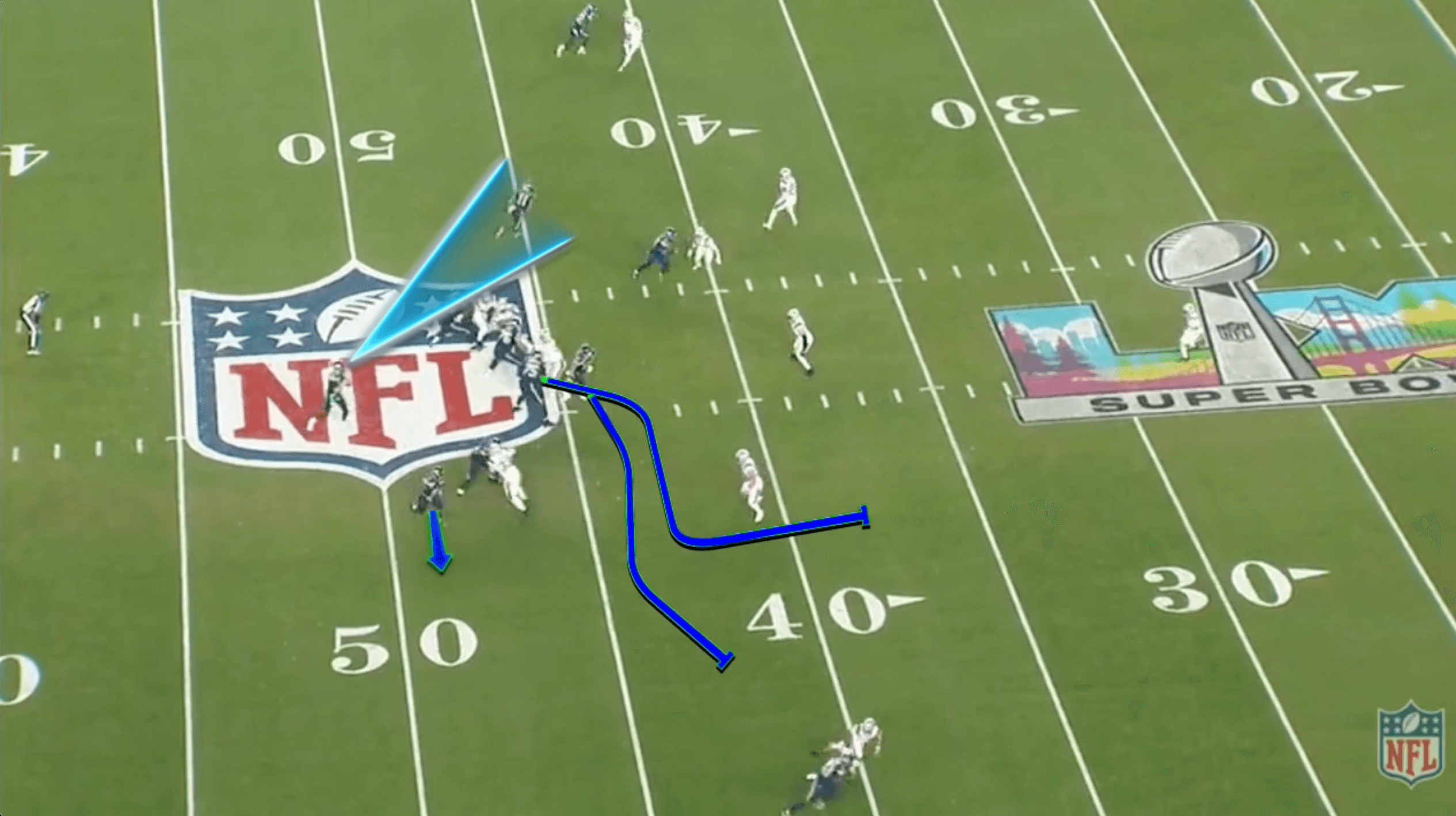 Knowing that the Patriots would be well aware of Smith-Njigba’s presence in the backfield after the NFC Championship Game, Kubiak designed a counterattack. After Smith-Njigba motioned into the backfield, the Patriots rotated a safety down to cover him and rotated the weak safety to the middle of the field.