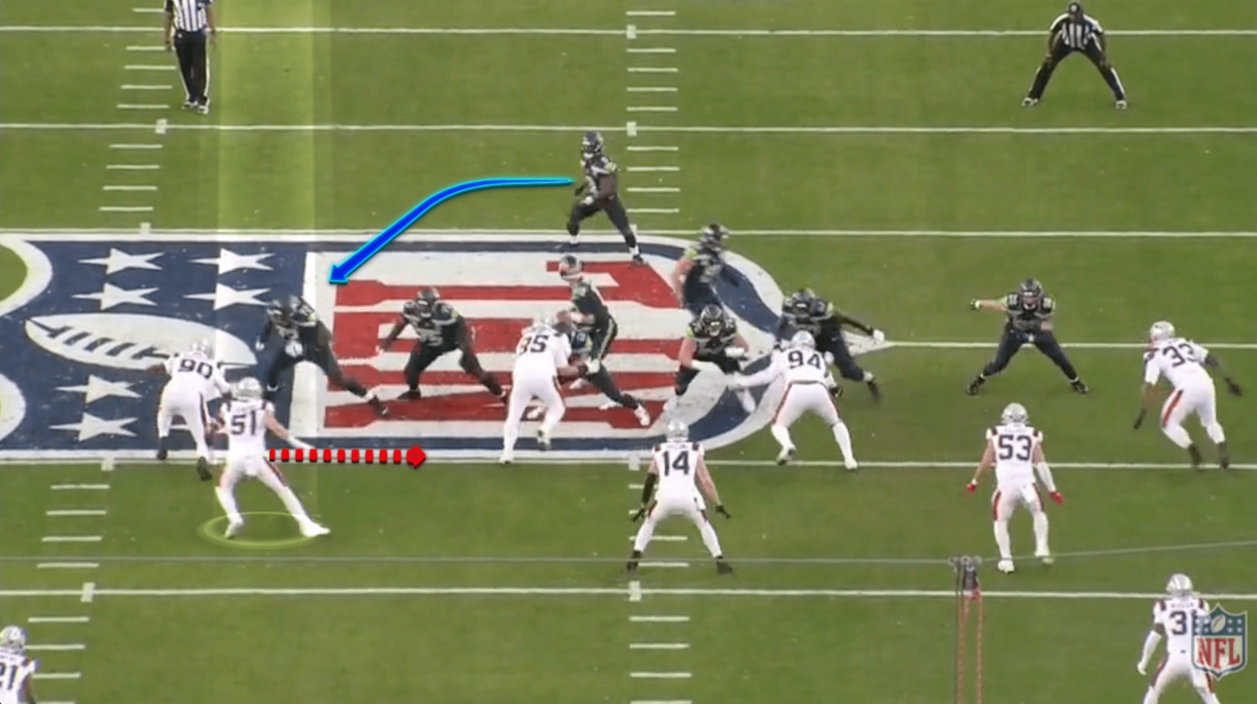The Patriots were well aware of this play, so before Seattle even ran Zorro, Kubiak called his counter to it. Barner motioned to the offensive left, causing the linebackers to bump in that direction.