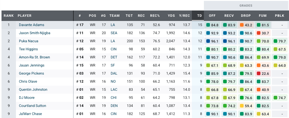 Adams operated as his team’s No. 2 wide receiver for the first time in several seasons, and he thrived in the role. His 84.8 PFF overall grade ranked ninth at his position, his highest mark since 2022. Adams led the league in receiving touchdowns (15), and quarterback Matthew Stafford generated a 106.8 passer rating when throwing his way, 19th among 80 qualifying wide receivers.