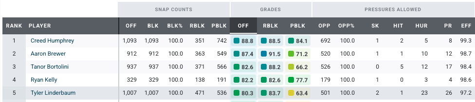 Linderbaum continued to establish himself as one of the top centers in the NFL, earning a career-high 80.3 PFF overall grade in 2025 that ranked fourth among centers. He also ranked fourth in PFF run-blocking grade (83.7). In addition, he graded positively on 15.7% of run plays, which ranked seventh.