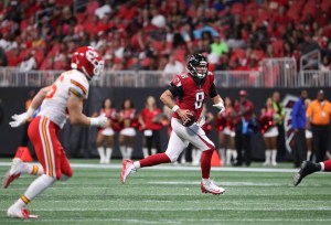 Aug 17, 2018; Atlanta, GA, USA; Atlanta Falcons quarterback Matt Schaub (8) runs for a first down in the second quarter against the Kansas City Chiefs at Mercedes-Benz Stadium. Mandatory Credit: Jason Getz-USA TODAY Sports