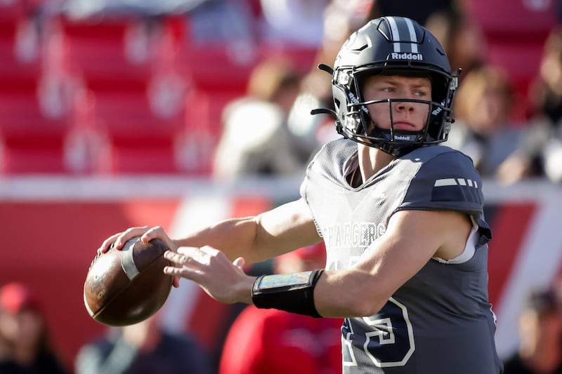 Corner Canyon quarterback Devin Brown lines up a pass in a 6A state semifinal game against Weber at Rice-Eccles Stadium in Salt Lake City on Friday, Nov. 12, 2021. | Spenser Heaps, Deseret News