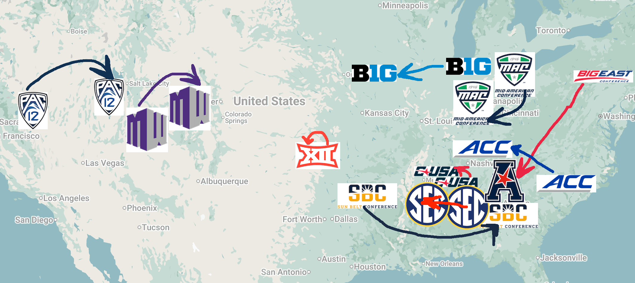 Technically, even Conference USA moved midward despite changing its entire roster in the meantime. But nobody should be mad at CUSA, merely a helpless passenger. (Its epic membership timeline is one of my favorite Wikipedia graphics.)