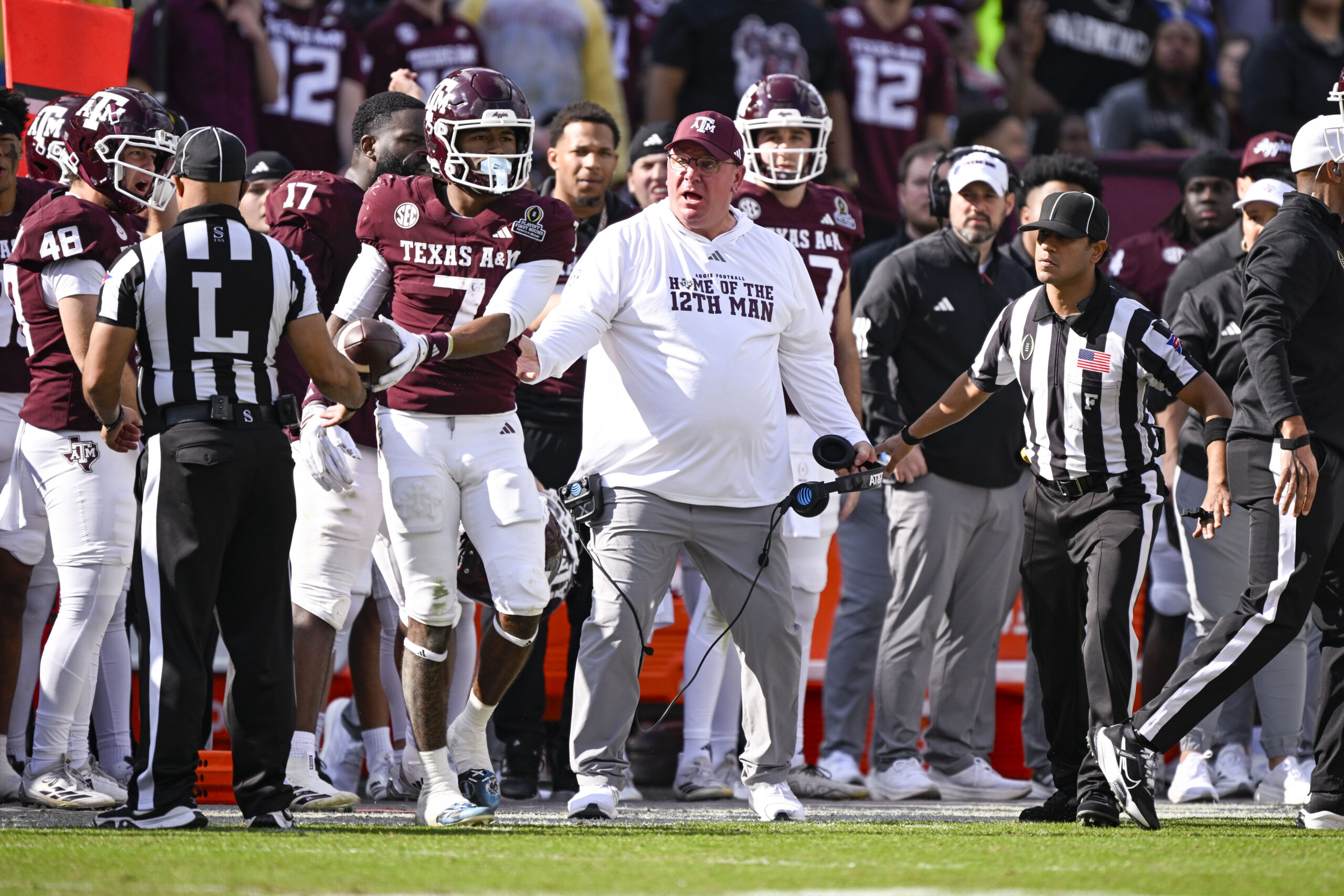 Dec 20, 2025; College Station, TX, USA; Texas A&M Aggies head coach Mike Elko reacts to a call during the game between the Aggies and the Hurricanes at Kyle Field. Mandatory Credit: Jerome Miron-Imagn Images