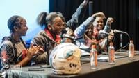 Miami Edison Lady Red Raiders flag football team at the podium answering questions during Media Day.