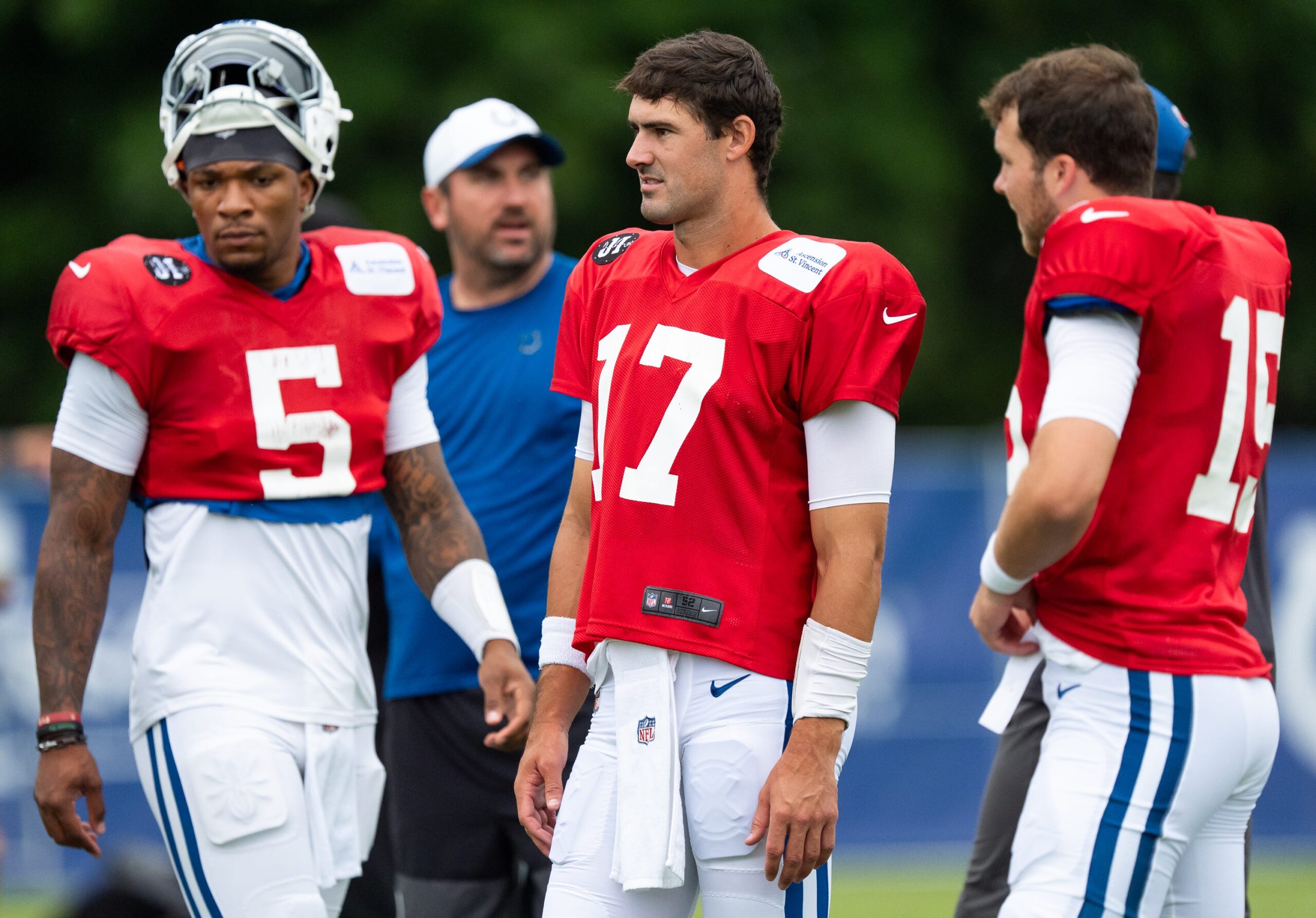 Indianapolis Colts quarterbacks Anthony Richardson Sr. (5), Daniel Jones (17) and Riley Leonard (15) prepare for drills Monday, July 28, 2025, during training camp held at Grand Park in Westfield.