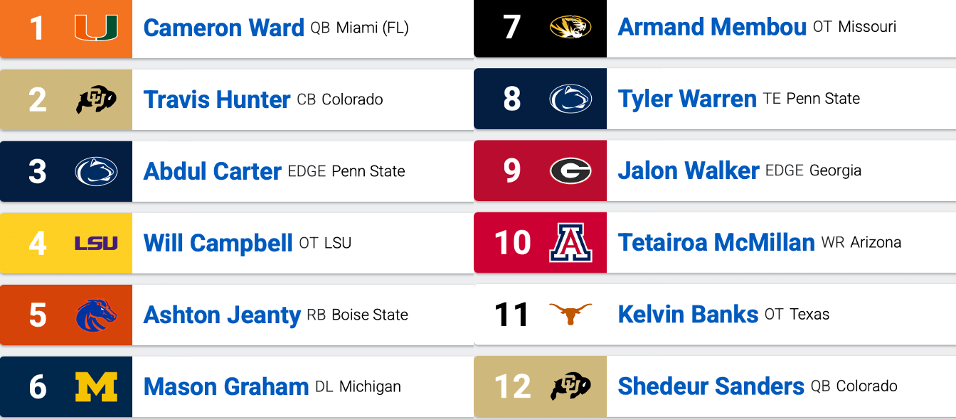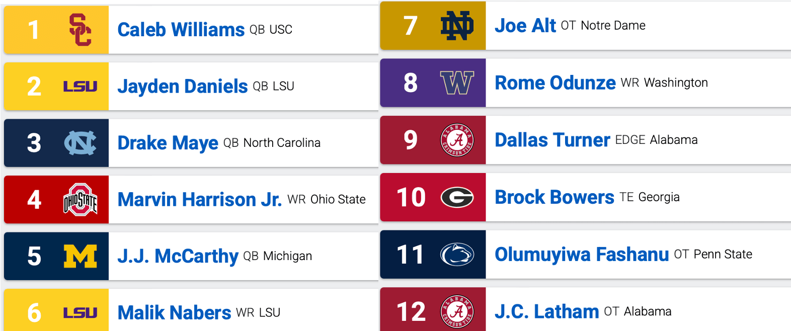 It’s too early to tell, because a lot happens between now and the draft. Some of it out in the open (i.e., the NFL Combine), and some behind the scenes (e.g., top 30 visits and rumors from NFL insiders). At the moment, though, here is the consensus big board: