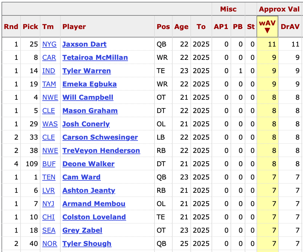 The wAV metric is somewhat biased toward QBs…because they like everyone else see QB as the most valuable position on a football team. Even just among QBs, though, Dart led the pack, with Shough as well as No. 1 pick Cam Ward having a wAV of 7. The cumulative two-year wAV for last year’s rookie class is led by Caleb Williams, Jayden Daniels, and Drake Maye, all with 26, and Bo Nix with 25, so if Dart has a successful sophomore season – and is able to stay on the field – he will be on a pace comparable to them.