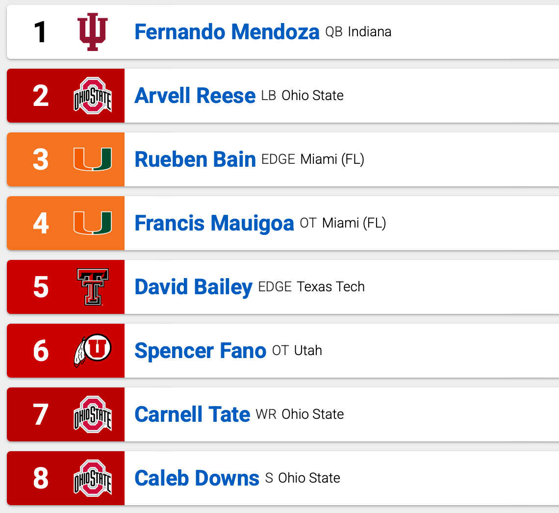 Other than Fernando Mendoza not being the Giants’ pick, that list is pretty fluid. For example, Brugler’s list is somewhat different: