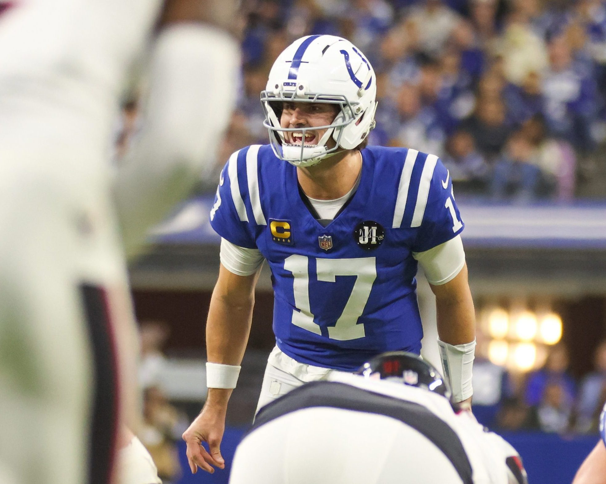 Daniel Jones calls a play during an Indianapolis Colts football game. Photo by Clay Maxfield
