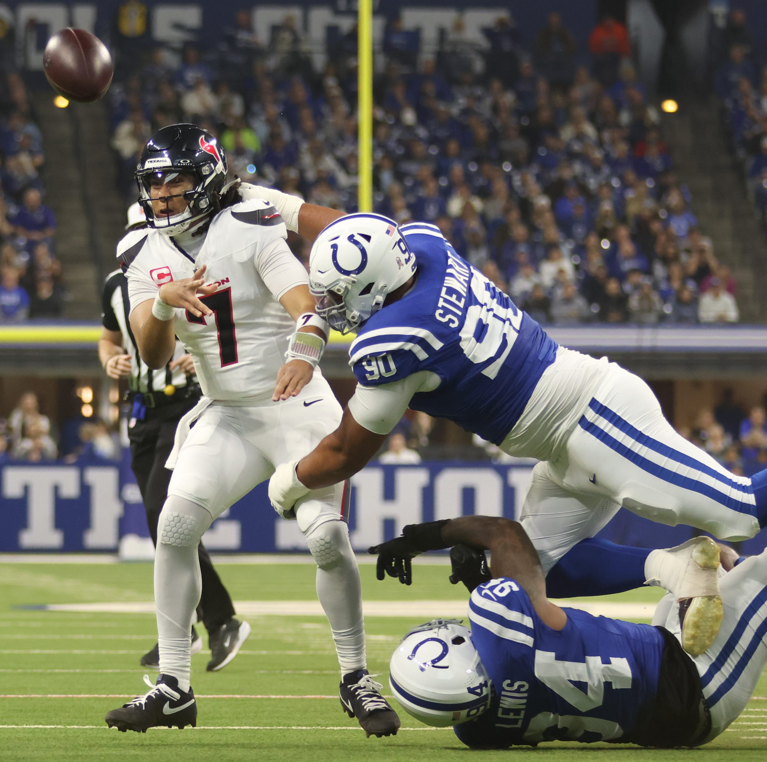 Grover Stewart (90) tackles C.J. Stroud (7) during an AFC South contest at Lucas Oil Stadium. Photo by Clay MaxfieldBut, the question at quarterback still looms. Once Daniel Jones went down with an Achilles injury, retired field general Philip Rivers was called in for his second stint, mainly because of his familiarity with coach Shane Steichen and the Colts’ offense. But even his “dadgummit” attitude couldn’t turn the tide. Backup Riley Leonard started the final game and did himself proud, casting a glimmer of hope that if Jones isn’t the answer, one day he may be able to take the reins. But if Daniels does not get the franchise tag or isn’t resigned, it’s not out of the question Ballard may bring in an experienced quarterback like Derek Carr, also retired. Prognosticators have the team drafting North Dakota State quarterback Cole Payton at 189.