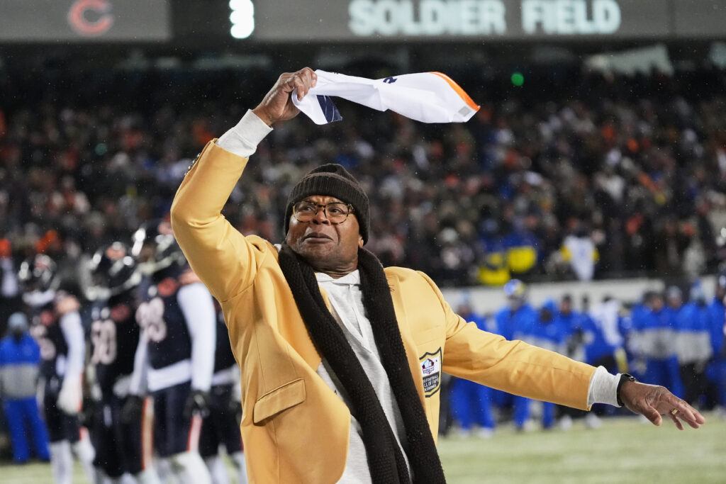 Jan 18, 2026; Chicago, IL, USA; Chicago Bears Hall of Fame linebacker Mike Singletary acknowledges the crowd during the fourth quarter of an NFC Divisional Round game against the Los Angeles Rams at Soldier Field. Mandatory Credit: David Banks-Imagn Images