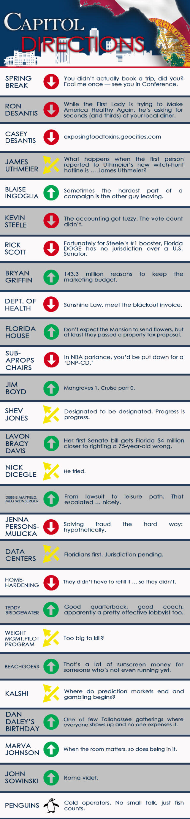 RON DESANTIS – Down arrow – While the First Lady is trying to Make America Healthy Again, he’s asking for seconds (and thirds) at your local diner.
