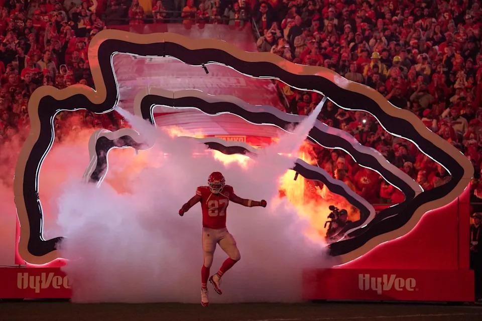 Oct. 27, 2025: Travis Kelce runs onto the field during player introductions prior to the Kansas City Chiefs’ game against the Washington Commanders at GEHA Field at Arrowhead Stadium.