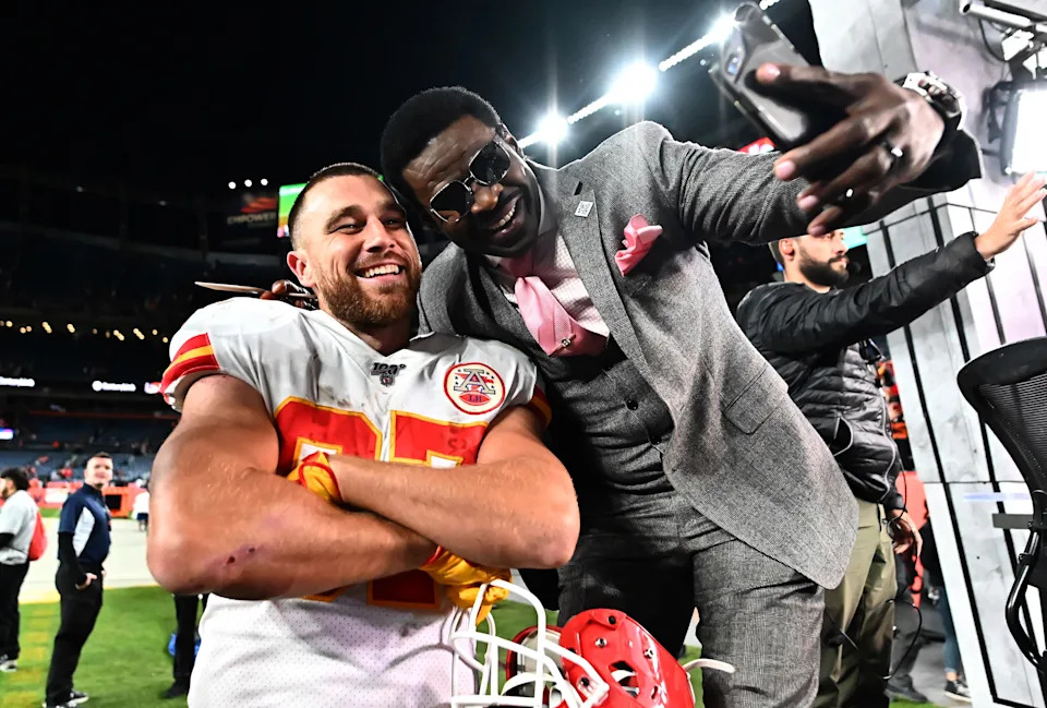 Oct. 17, 2019: Travis Kelce takes a selfie with Pro Football Hall of Famer and broadcaster Michael Irvin following the “Thursday Night Football” game against the Denver Broncos.