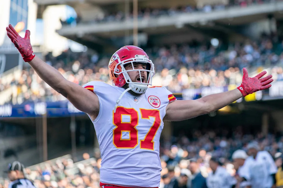Dec. 2, 2018: Travis Kelce celebrates after scoring a touchdown during the Kansas City Chiefs’ 40-33 win against the Oakland Raiders at Oakland Coliseum.