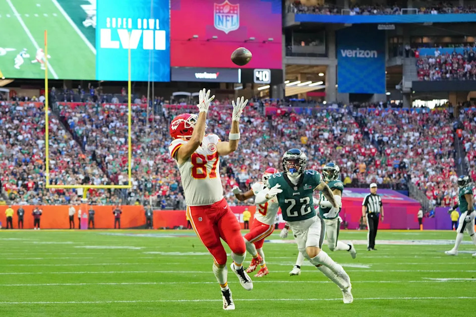 Feb. 12, 2023: Travis Kelce makes a catch for a touchdown against the Philadelphia Eagles during the first quarter of Super Bowl LVII.